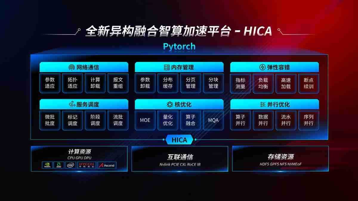 通过自研的服务层、、、、中间适配层、、、以及调度编排算法,,,采用数据并行、、、、模型并行等多种并行方式,,,把并行计算任务进行有效的分解,,,使其分别由相应的软件栈和算力资源来承接。。当GPU资源变化,,,,HICA可以实时动态调度计算子任务并调整模型拓扑和架构,,,,以充分聚合各种算力资源。。。。
