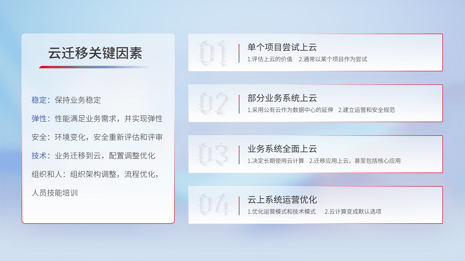 结合实际业务,,,从规划设计、、云平台选型、、云原生改造、、、、数据迁移、、集成交付,,,,迁移全过程为客户识别最佳上云路径,,,,做好风险识别管理,,设计网络架构、、身份权限、、安全审计合规、、、操作审计、、、日志审计、、监控告警策略、、、多站点容灾设计等,,,对云上基础设施进行整体规划,,,提升IT治理水平,,,,以满足弹性、、、、高可用、、高性能的需求。。